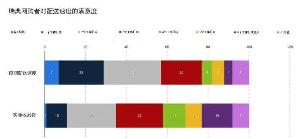 物流时效是瑞典电商市场拓展的重要考量因素。多数消费者希望物流配送时效控制在3个工作日以内。2020年瑞典国内配送的平均运输时间为2.1天,相比其他欧洲国家略长。卖家在推进瑞典电商市场拓展时,需要合理管理消费者预期,并提供准确的物流跟踪服务。